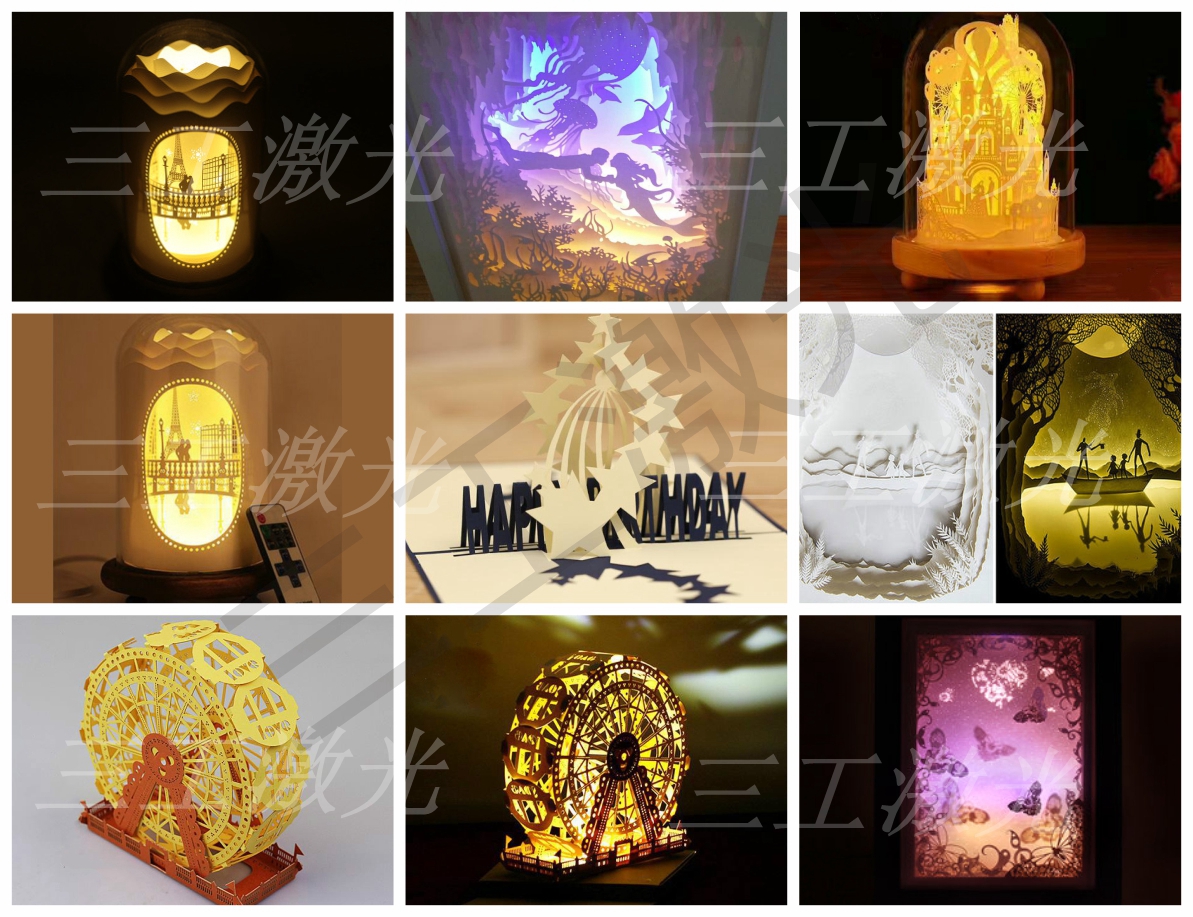 利用激光和各種類型的不同紙張,在創(chuàng)作的時候是先設(shè)計好圖案,然后根據(jù)圖案將眾多紙張用激光逐一切割好,最后再將切好的紙張再一組合起來。錯綜繁復(fù)的層次、精美絕倫的圖案讓人眼花繚亂,我們與其說是剪紙或畫作,倒不如說是立體感十足的激光雕塑。這就形成了藝術(shù)品光影紙雕燈!