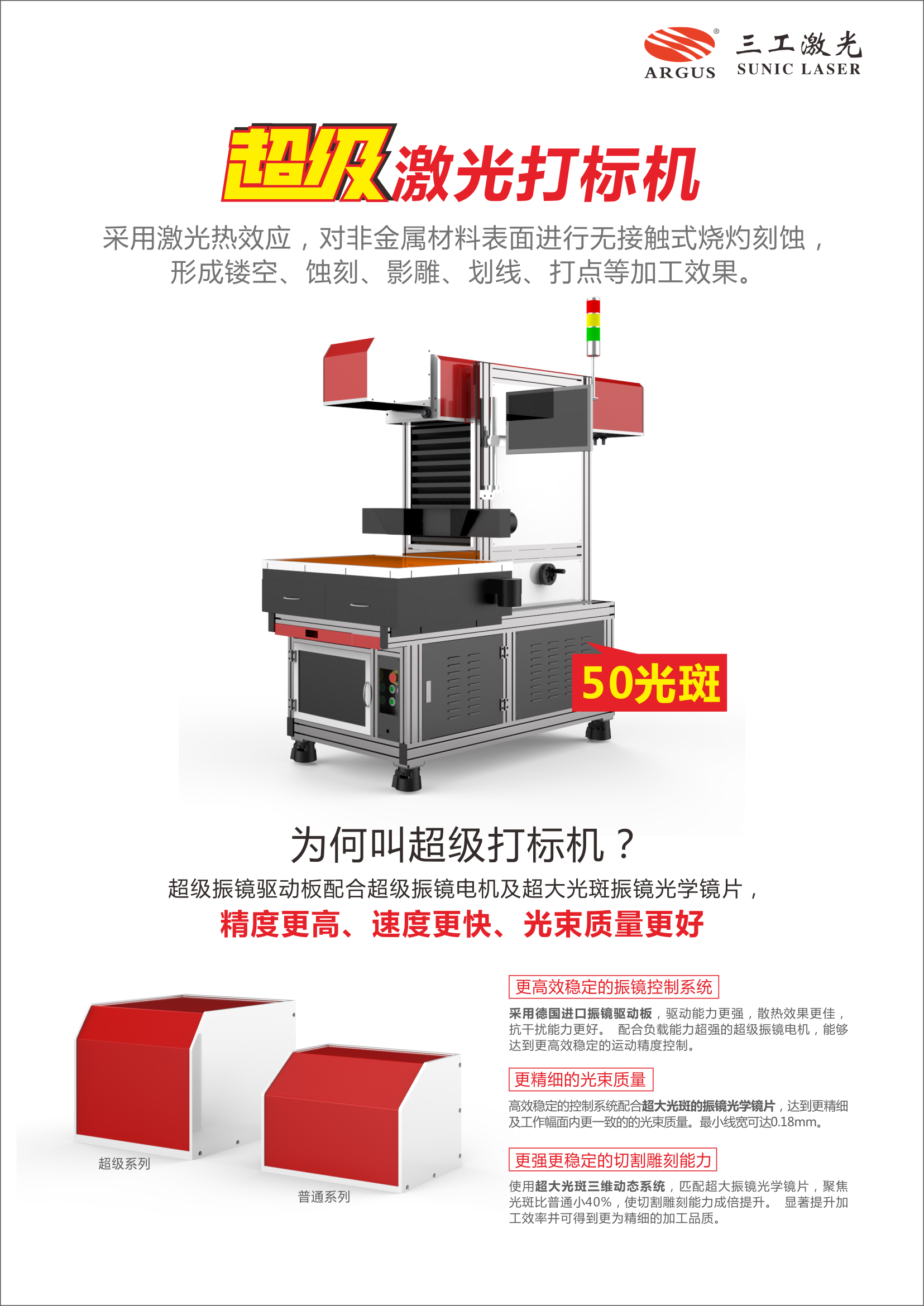 三工超級激光打標機采用自主研發(fā)激光標記系統(tǒng),該系統(tǒng)應用工業(yè)標準化模塊設(shè)計,全套進口金屬封裝射頻CO2激光器,均配裝有高速掃描振鏡和擴束聚焦系統(tǒng),高穩(wěn)定,抗干擾 工業(yè)計算機智能控制,高精密的升降式工作平臺,實現(xiàn)24小時連續(xù)穩(wěn)定可靠運轉(zhuǎn),打標精度高,速度快。