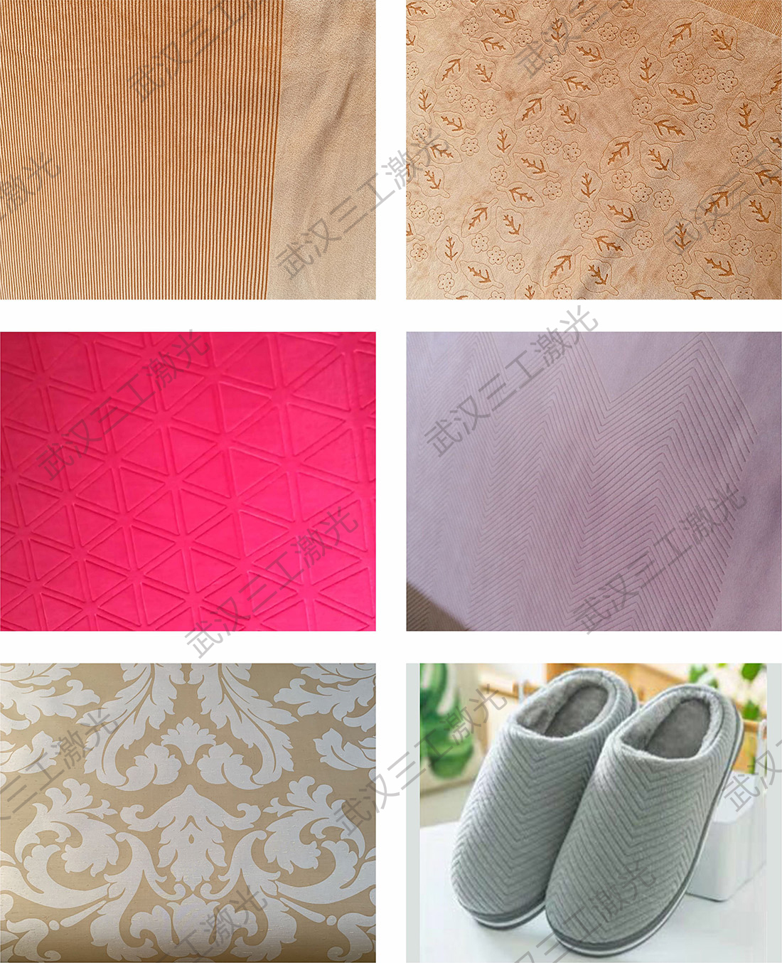 燒花,是指花型通過經(jīng)線和緯線織出來的,然后再運用激光雕刻的方式,雕刻出立體花型的制作工藝。即利用激光的高能量密度特性,將花型“燒”出立體感。它的特點是檔次較高,切邊自動熔合,無散口現(xiàn)象。燒花工藝制作的花型像從空中飄來般自然,既真實又具有豐富的層次感。