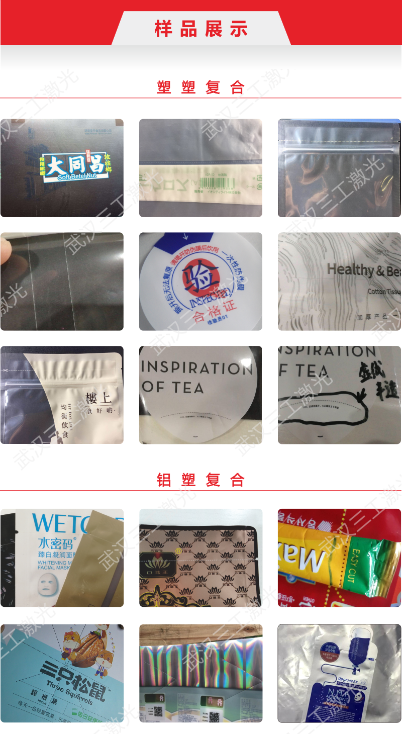 適用材料:適用于各種薄膜材料打標(biāo),如PVC、PET、PE、多層符合薄膜等表面的激光連續(xù)易撕線,激光透氣孔等工藝。