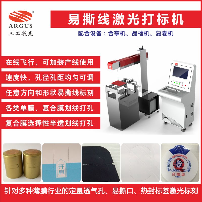 商品包裝或者包裝的表面總是有一層塑料薄膜來保護(hù)商品以免受潮或者污染,為了便于打開,經(jīng)常有設(shè)計(jì)的有易撕口或者虛線孔,這一小小的設(shè)計(jì)給生活帶來了便利。經(jīng)常會看到一些物品采用薄膜軟包,上面有一排小小的透氣孔,例如常見的電子產(chǎn)品充電器上,一層薄薄的軟薄膜,淺淺的一排定量透氣孔。定量透氣孔采用激光打孔,便捷快速,效果好。三工激光定量透氣孔激光打孔機(jī),以其優(yōu)越的加工特性,成為很多商家的選擇。三工激光易撕線激光刻線機(jī)主要用于不同材質(zhì)的塑料包裝袋 ,例如PE、PVC、PET等各種薄膜材質(zhì)??捎糜陲嬈凤嬃稀⑽幕闷?、五金工具、日用百貨、電子電器、金屬制品等行業(yè)的定量透氣孔、易撕口、熱封標(biāo)簽等激光標(biāo)刻。