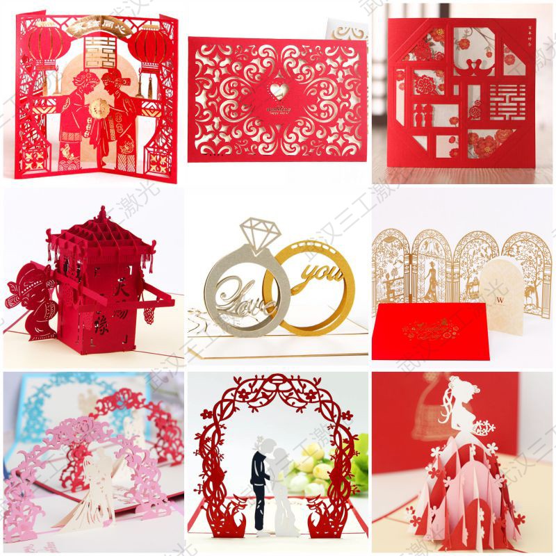 婚禮請柬完全可以摒棄正正方方的外觀,在電腦上制圖后,武漢三工請柬激光鏤空機(jī)就能不受限制地依據(jù)圖紙上的內(nèi)容制作出所需要的圖案或文字內(nèi)容,打開請柬后便能出現(xiàn)立體的圖形。