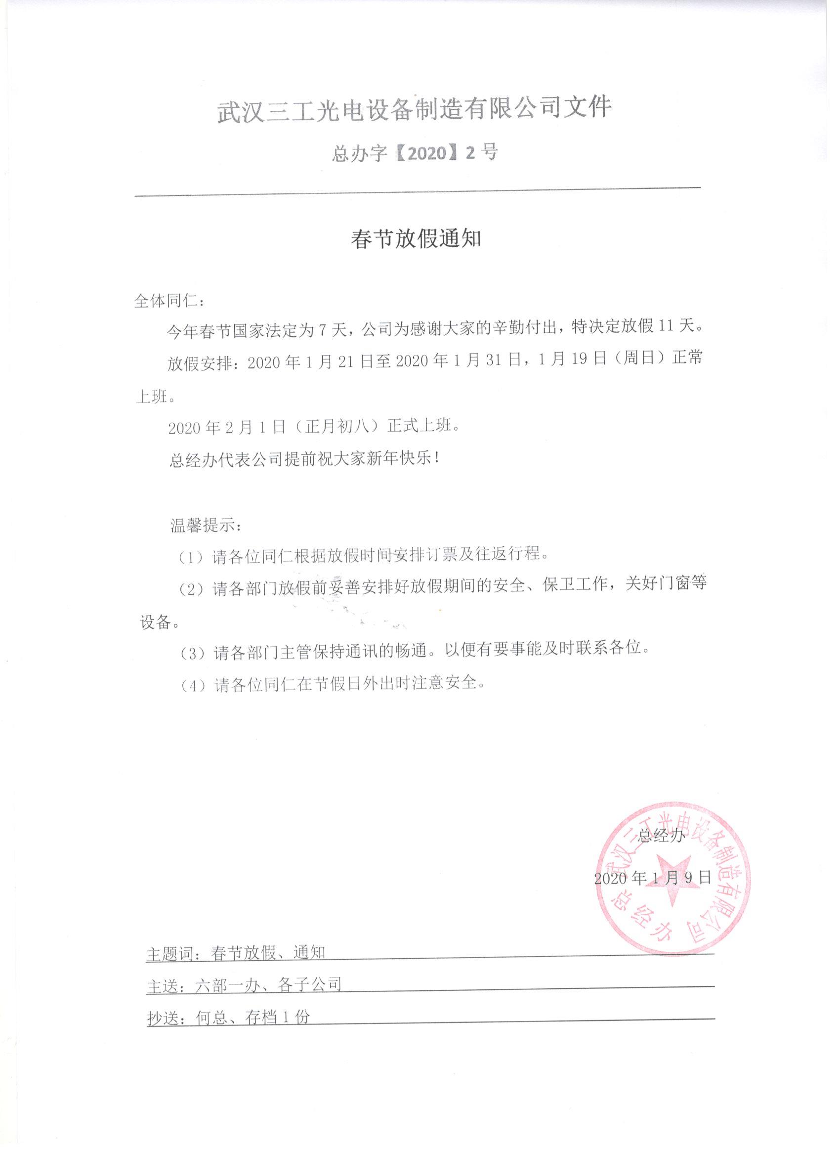 武漢三工集團(tuán)2020年春節(jié)放假通知